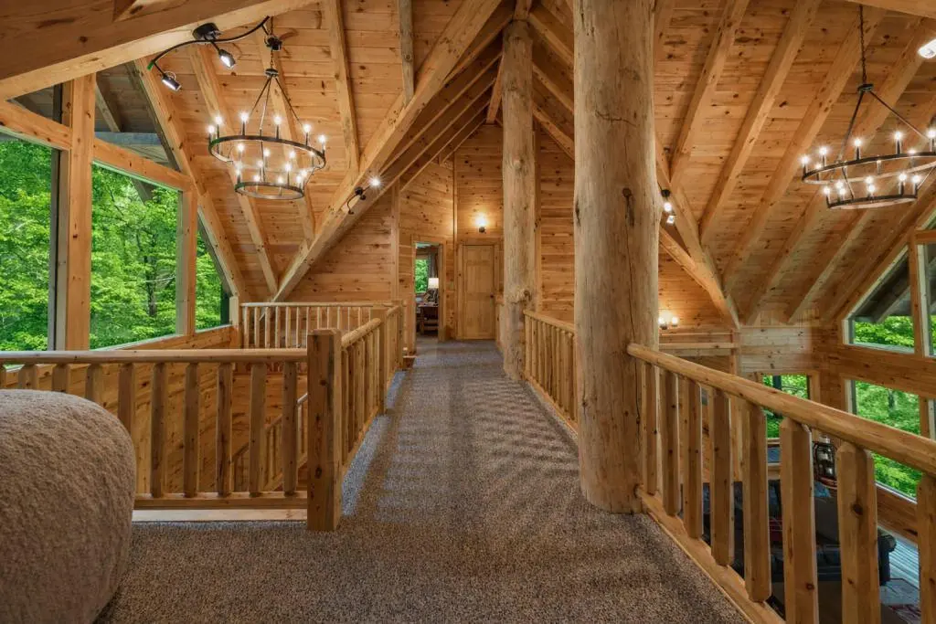 New 2022. 8 king bedrooms. 5.5 bathrooms. Pool table, air hockey, hot tub, laundry, indoor/outdoor fireplaces. 1st floor wheelchair accessibility: zero entry shower, wider hallways/doors to master bedroom. Blue Ridge Lodge sleeps up to 20 guests when booked direct through our site. The minimum age to rent is 28 w/ proof of id.