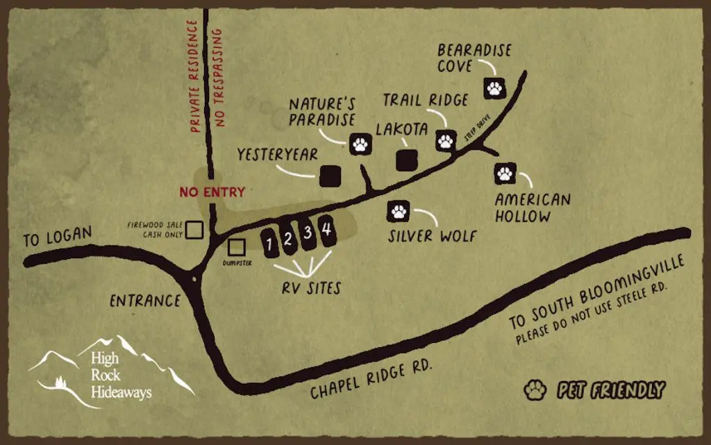 High rock is my families favorite camping spot. It is very quiet and secluded. There are only 4 RV spots that are spaced well away from each other and the cabins are also secluded. They even offer free fire wood! In addition, high rock has amenities such as a fishing pond and private trails that are just as beautiful as the Hocking Hills public trails. High rock is helpful with any concerns are do not bother you unnecessarily. We feel very comfortable. High rock is conveniently located a few minutes from the best public trials in Hocking hills. We plan a trip here at least once a year.Only downfall is no public shower house which is OK because they offer full hook up RV sites and with the limited RV sites, High rock books up very fast! Its beauty is no longer a secret! Verizon service is very spotty and Sprint is much more reliable, but of course we did not need much cellphone service because we enjoyed nature and our company.