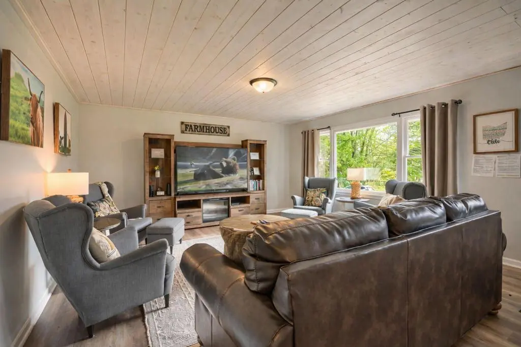On the main level you'll find 2 queen bedrooms and 1 full bathroom with tub/shower combo. The fully stocked kitchen, main living area with 70" smart-tv, and the electric fireplace are all on this level.